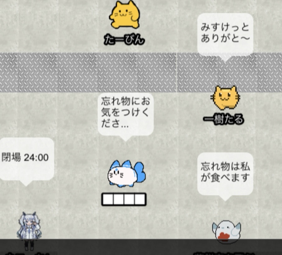 ずうっと入り口に立っていて、ふきだしで忘れ物注意や閉会時間をお知らせしている人たち。(有志の方…?)
