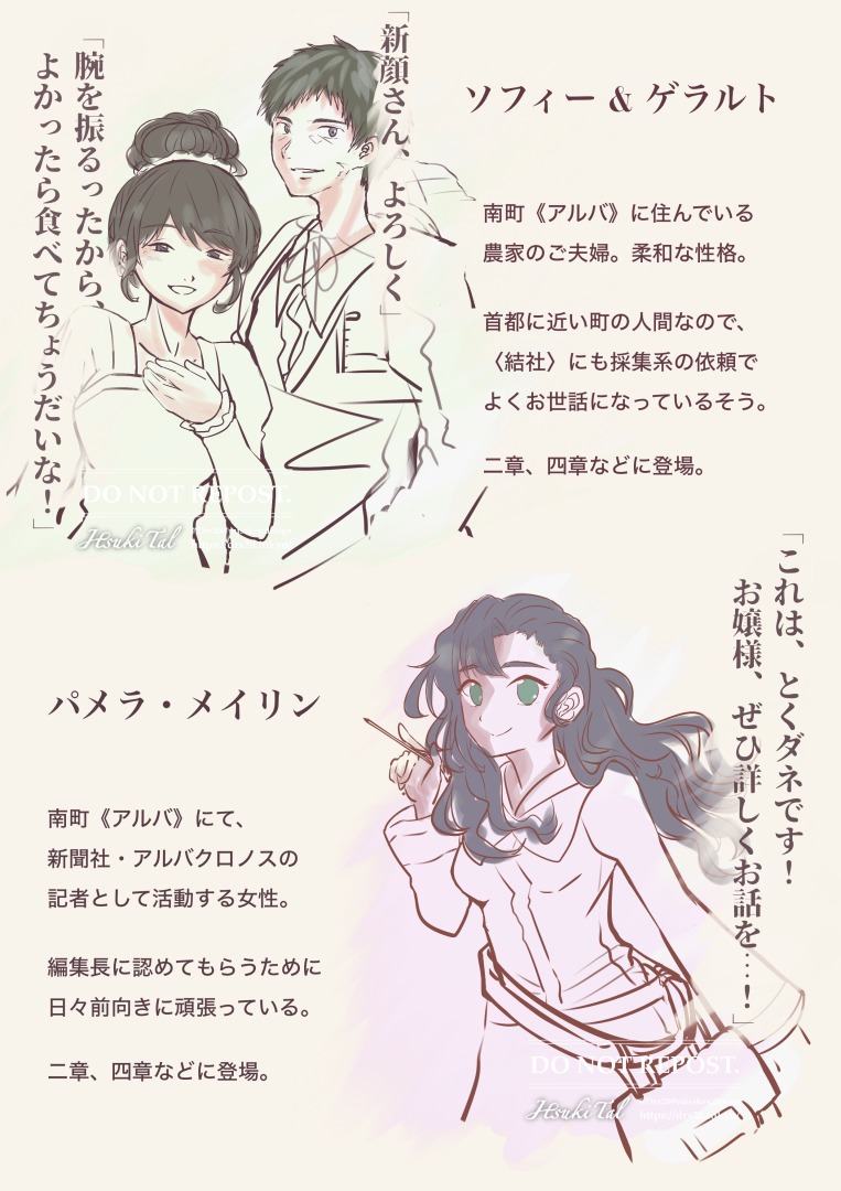 向かって左から、ルナン、シエル、メアリ。主人公3人組を描いてみました。サイト名『夕刻の手紙』にちなんで、夕方や明け方のようなイメージで。