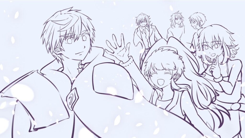 ・色分けしながら、細部(模様や手など)描く。←大きく映る部分は自分でポーズを撮り、専用素材にして使う。こういうときの誤爆が怖いので白黒画像にして使う。(?)